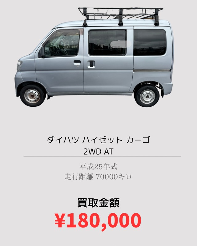 ダイハツ ハイゼット カーゴ 買取 買取金額: 180,000 円 ダイハツの軽バン、ハイゼットカーゴ買取させて頂きました。 軽バン各モデル高価買取させて頂きます。 即日現金買取も可能です、お仕事でお使いの軽トラ、軽バンご売却の際は是非、ご相談ください! /blog/blog_comments/captcha/24407816 /blog/blog_comments/get_token
