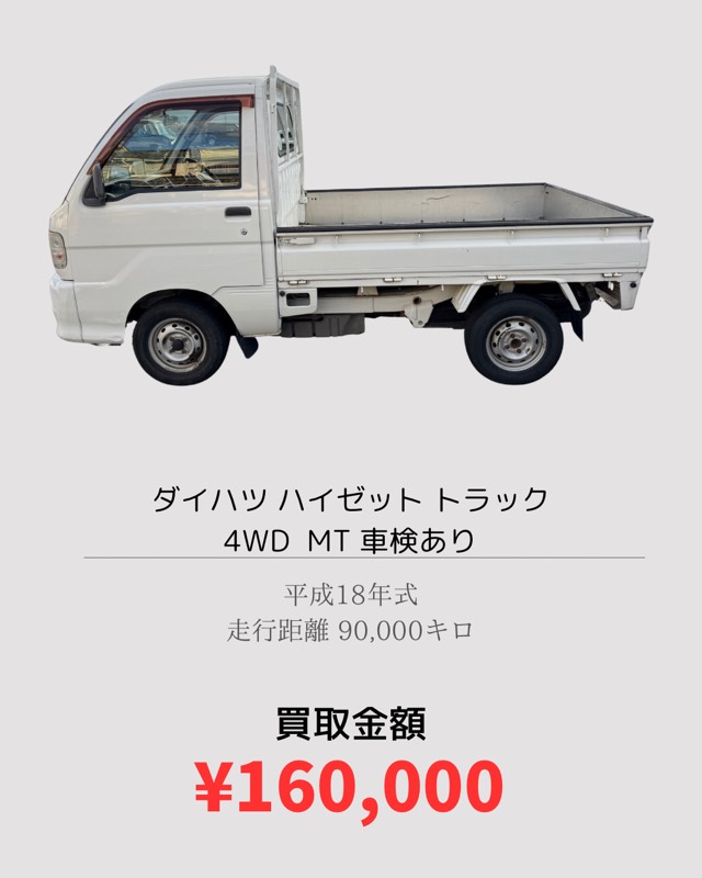 ダイハツ ハイゼット 買取 買取金額: 180000 円 人気の軽トラ、ダイハツハイゼットトラック買取させて頂きました。 基本の平ボディ、エアコン付きのおクルマでした。 4WDはいつでも高価買取可能です、即日対応も大歓迎。 軽トラ、軽バン、商用車の買取なら買取専門店の軽トラ買取道場にお任せください。 /blog/blog_comments/captcha/58314907 /blog/blog_comments/get_token