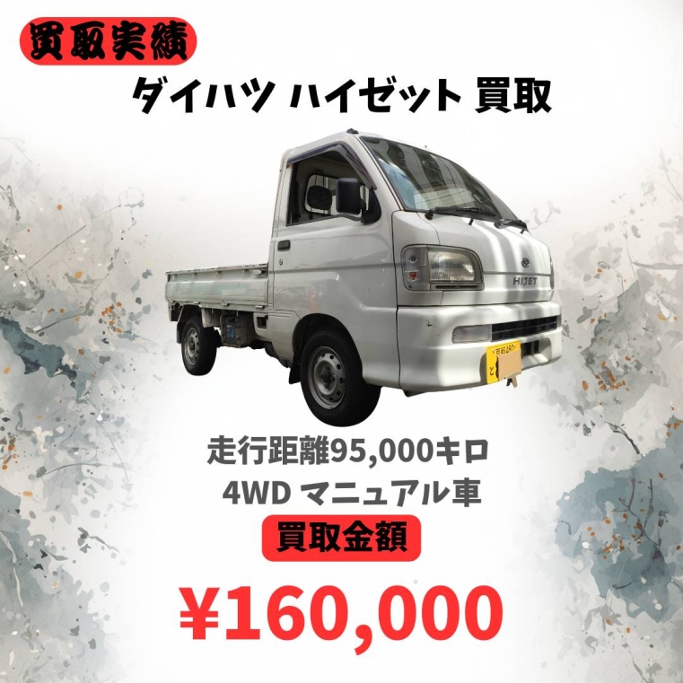 京都にてハイゼットカーゴ(4WD)を買取させていただきました。特に4WDモデルは需要が高く、今回も査定を頑張らせていただき高価買取となりまし...