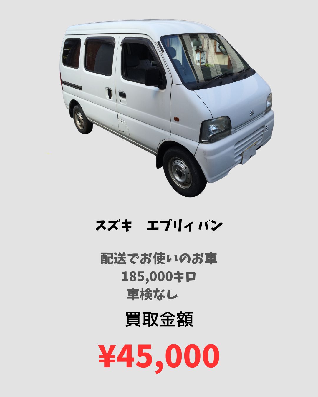 配送車 スズキ エブリィ バン 買取金額: 45000 円 当店で1番多く買取させて頂いてるのが、配送でお使いだった軽バンの買取です。 走行距離が多い車や、傷へこみの多い車が多いですが、お査定頑張らせて頂きます。 軽バン、軽トラ売るならぜひご相談ください。 1台から複数台の一括買取まで対応可能です。 /blog/blog_comments/captcha/86629098 /blog/blog_comments/get_token
